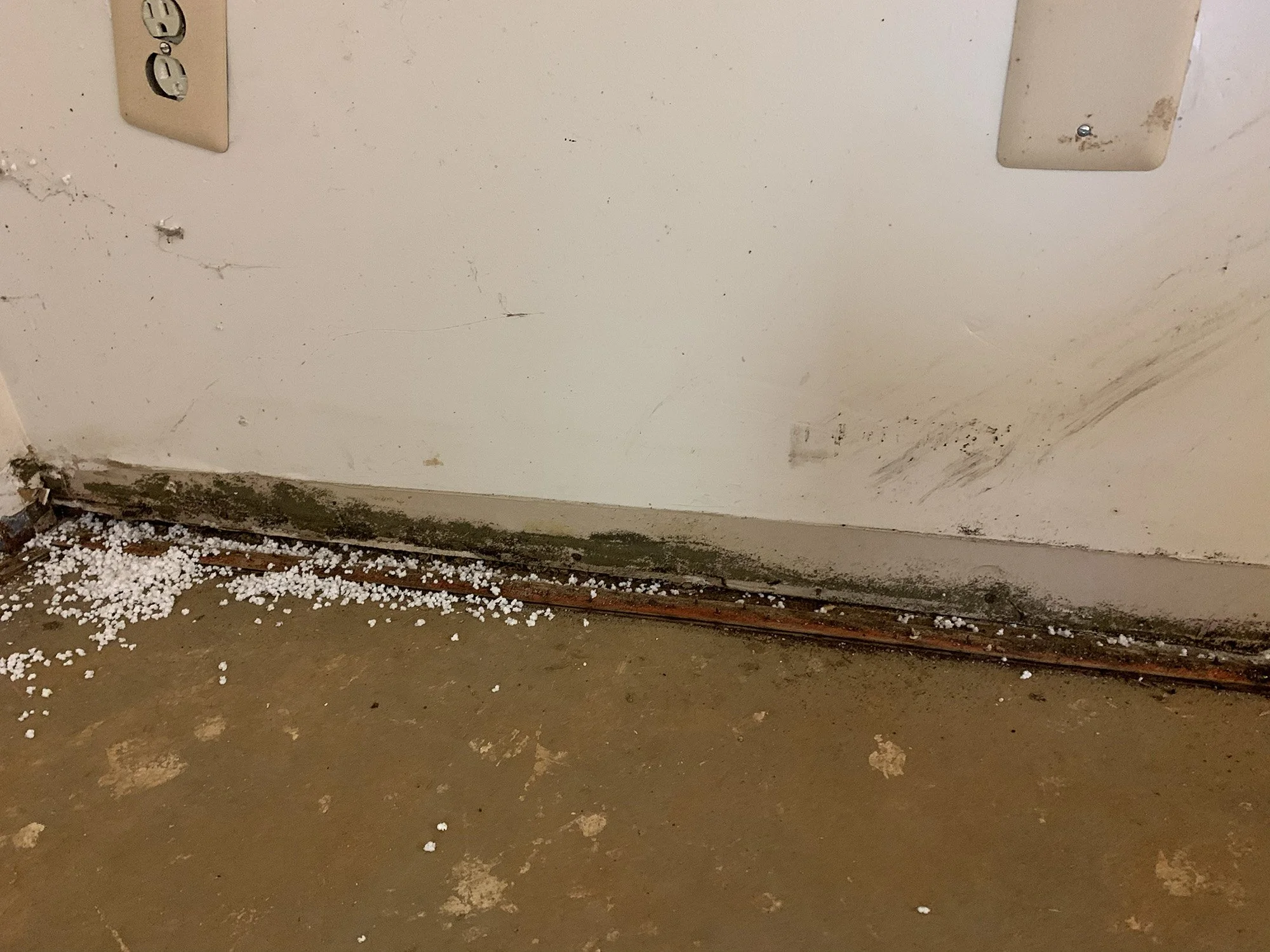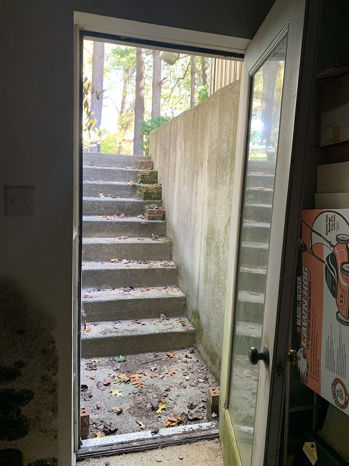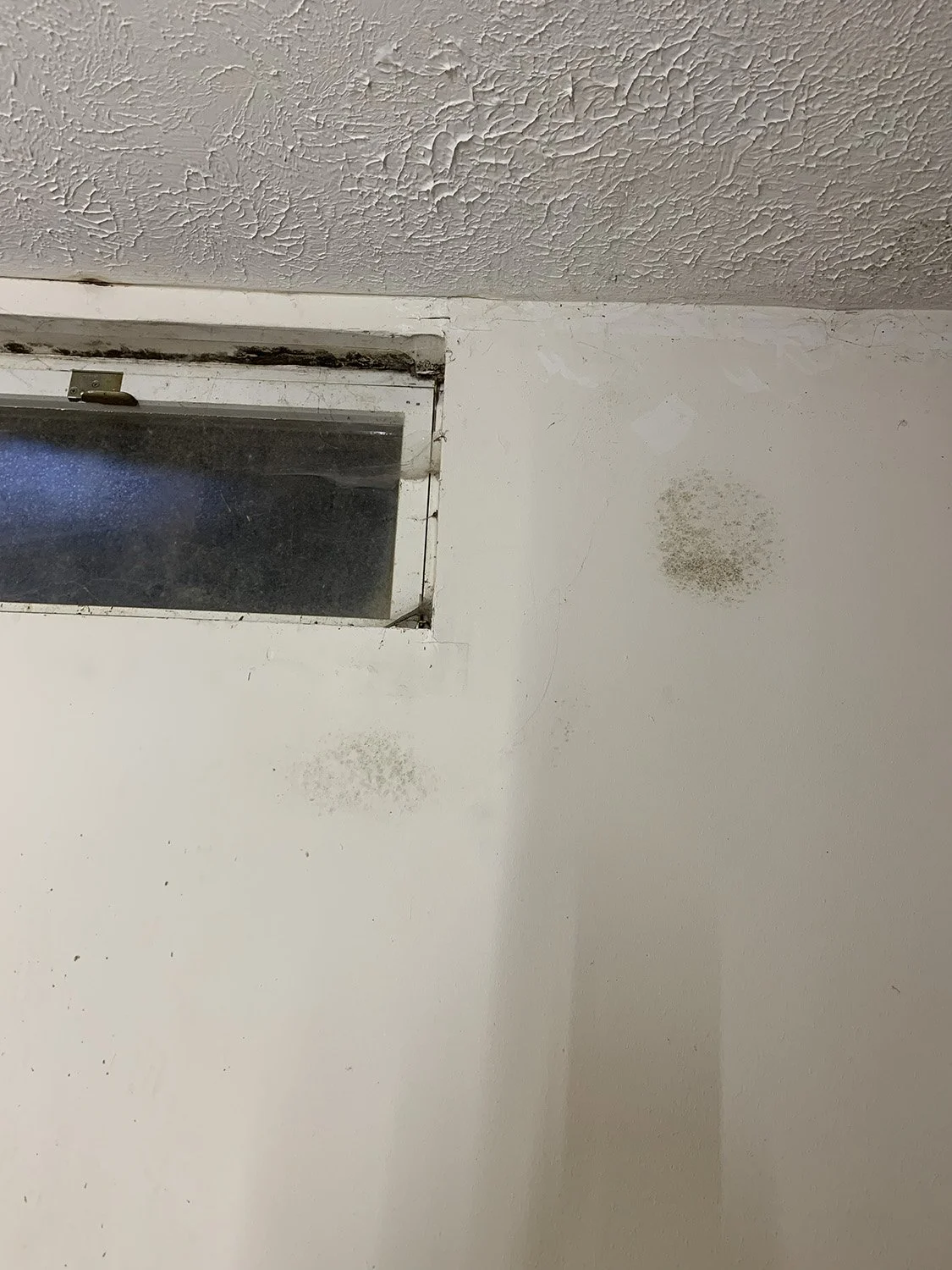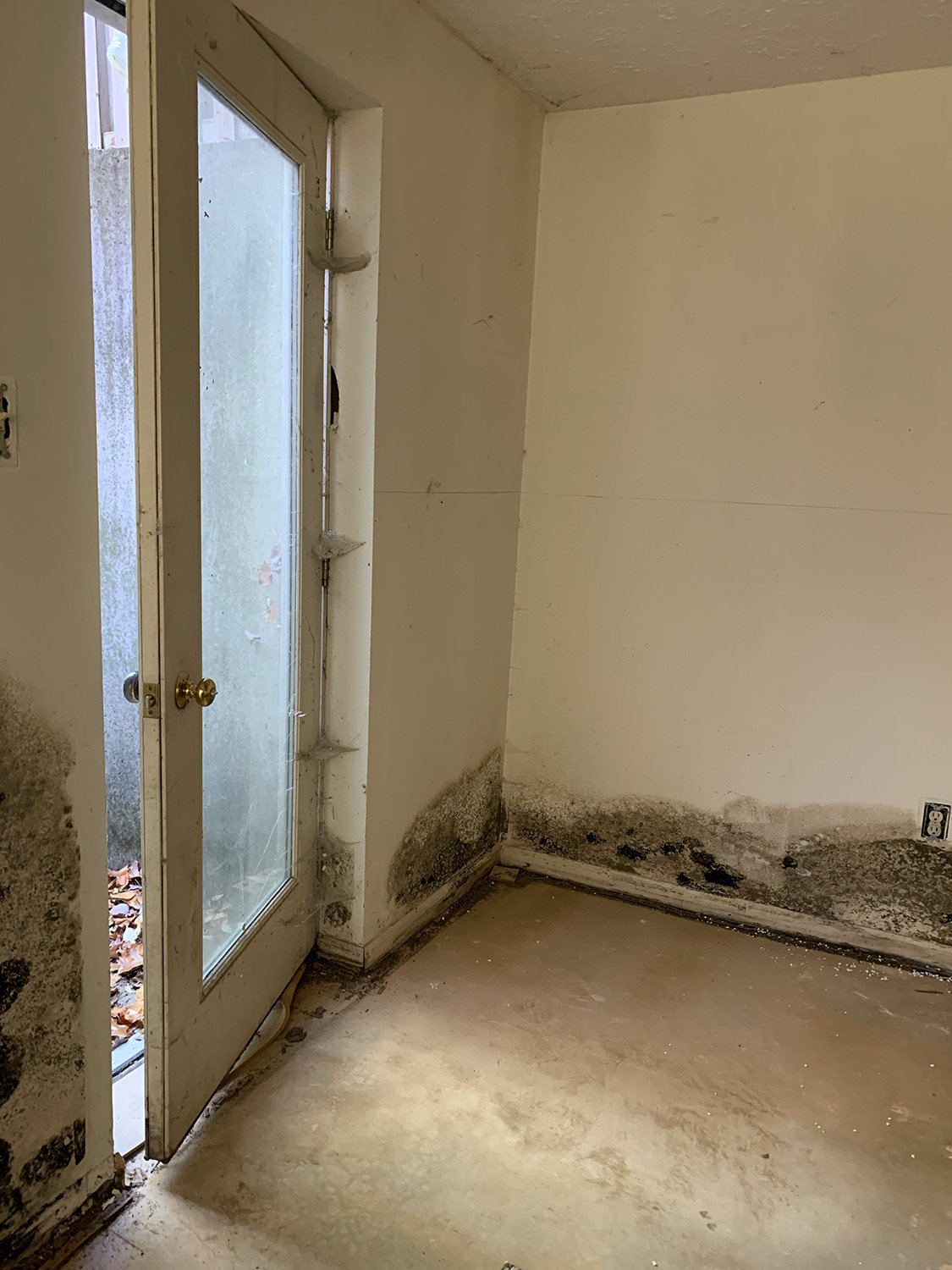 mold on walls continuing around to right of basement egress door - note to right of corner is not an exterior wall
