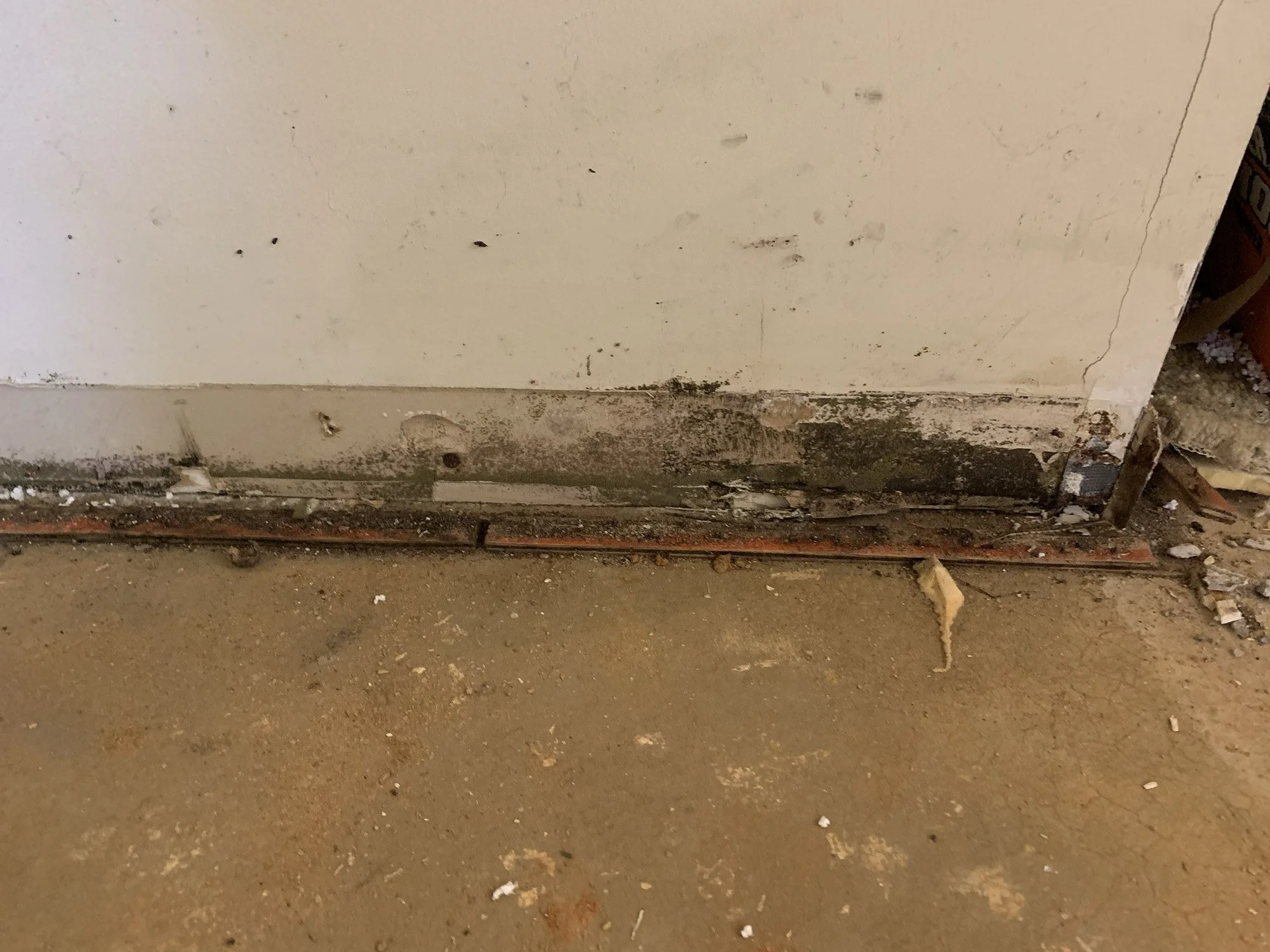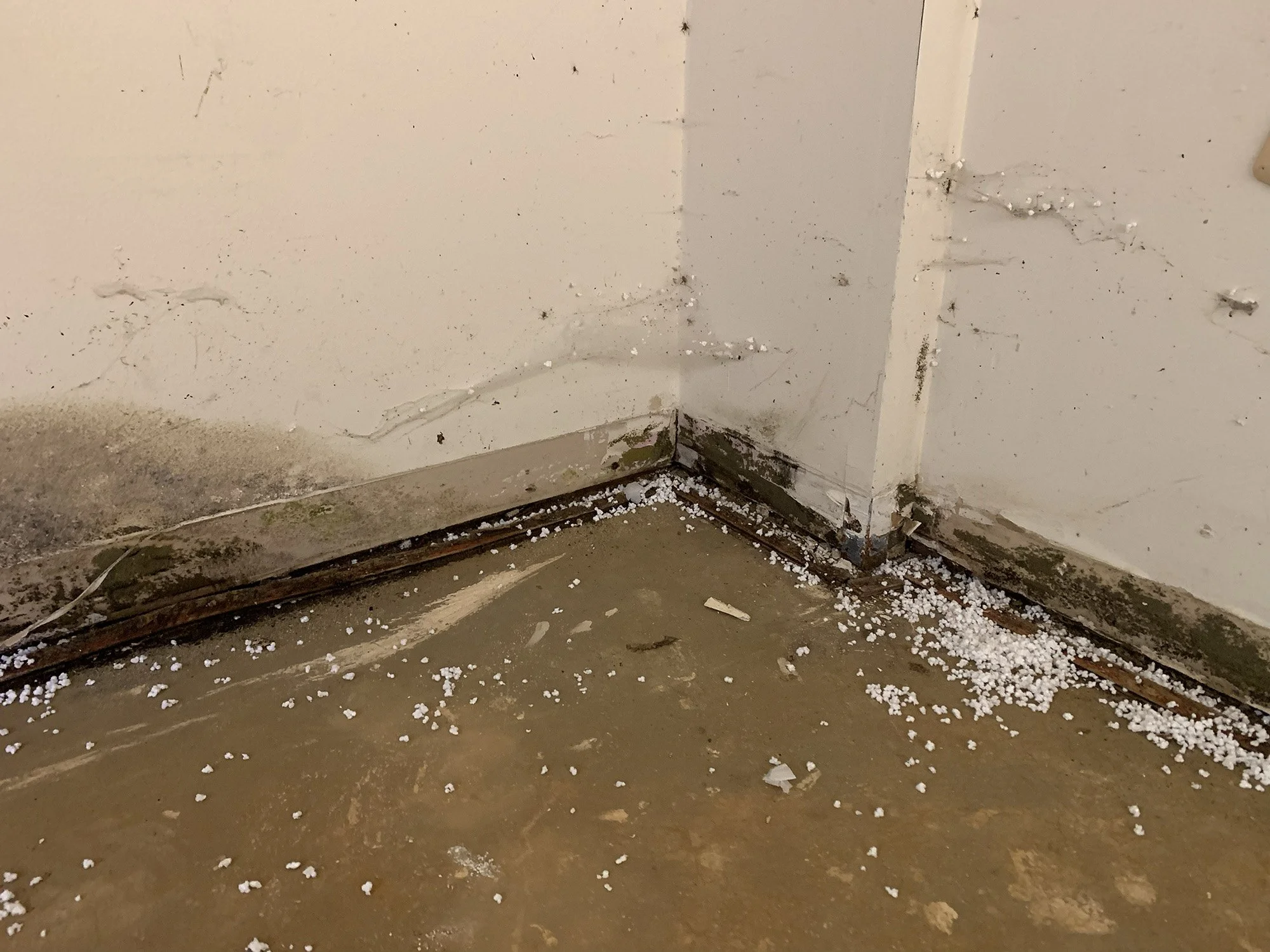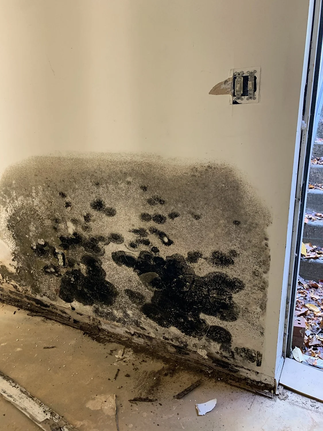 mold on walls continuing around to right of basement egress door - note to right of corner is not an exterior wall