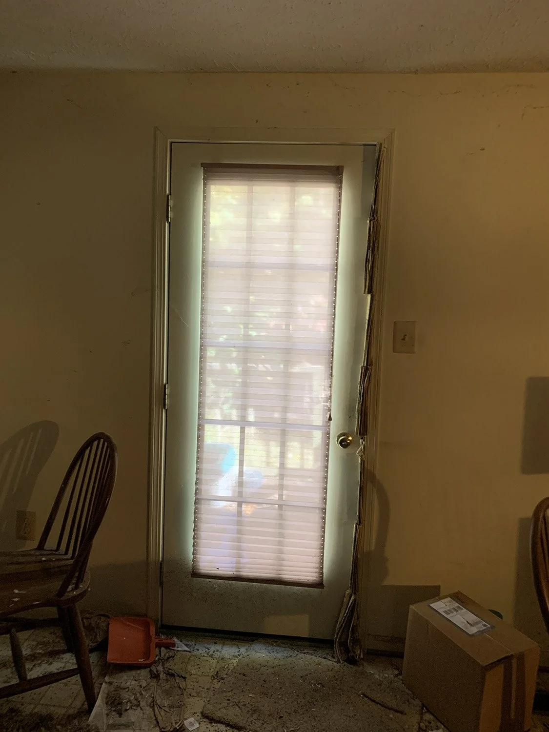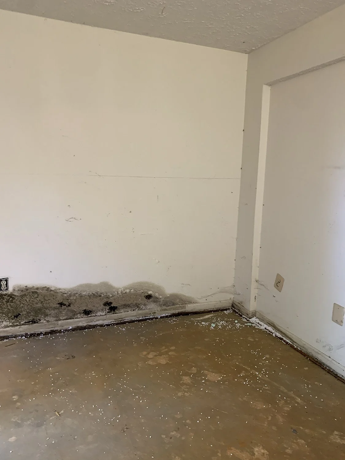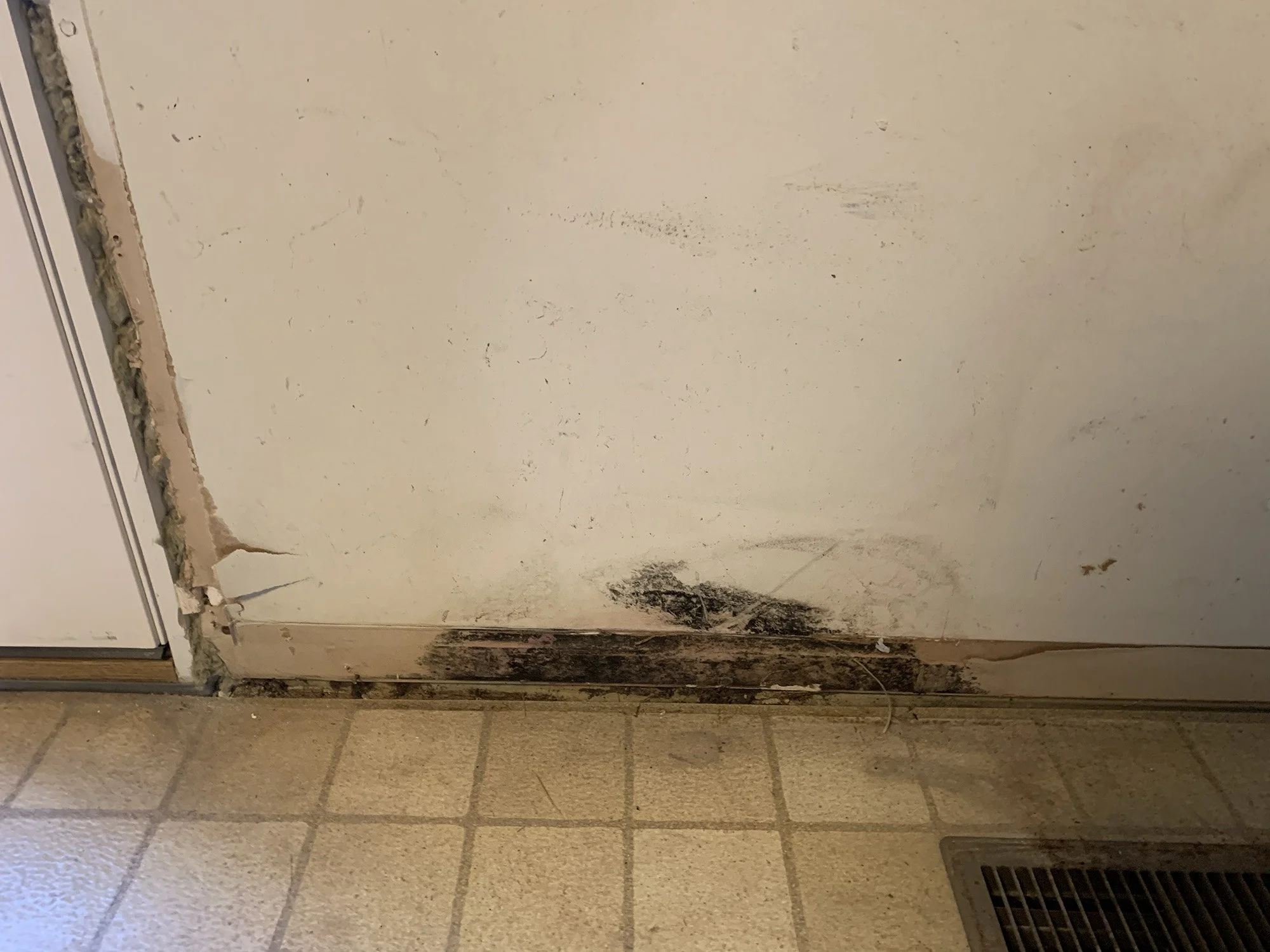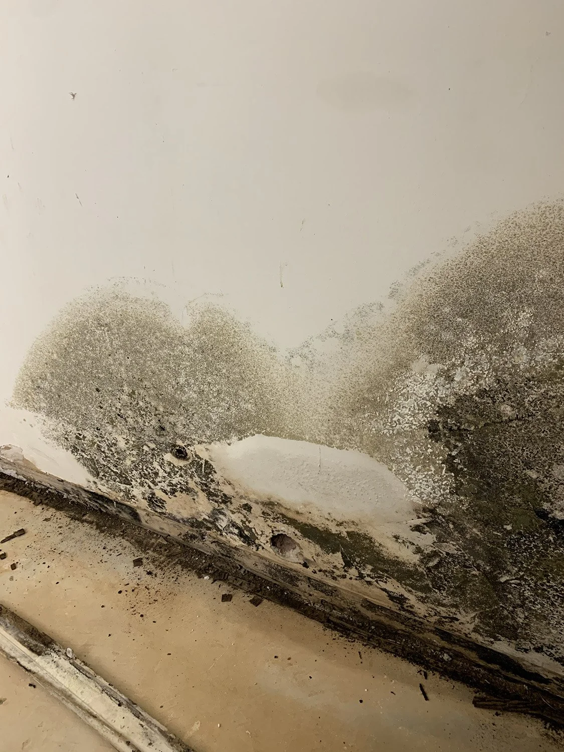mold on walls continuing around to right of basement egress door - note to right of corner is not an exterior wall