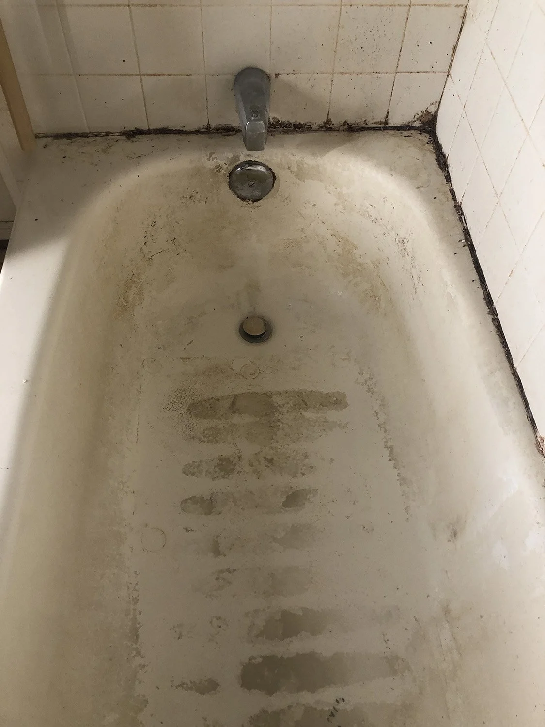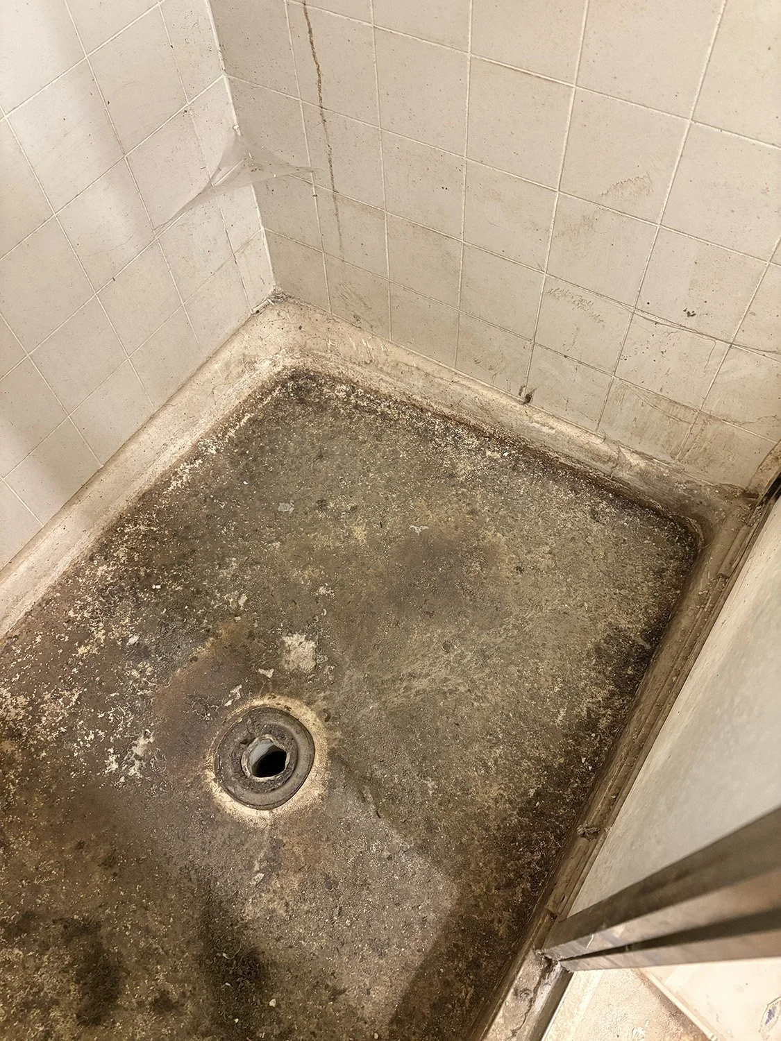 state of shower pan in basement bathroom. Drain was completely clogged and had to be replaced.