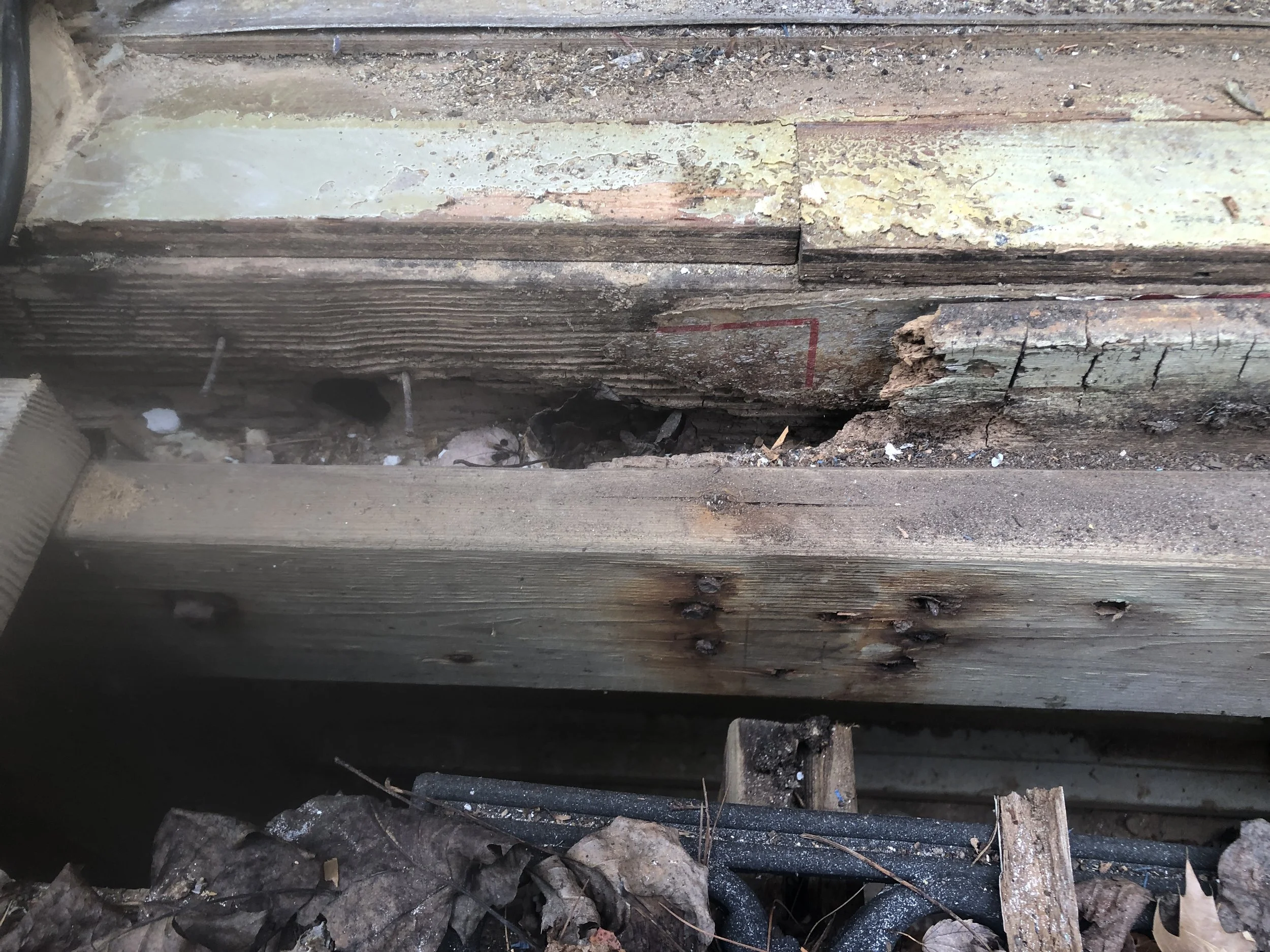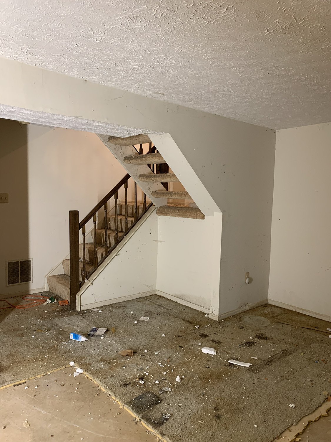 state of carpeting in basement prior to removal. Carpeting throughout house was in a similarly damaged state.
