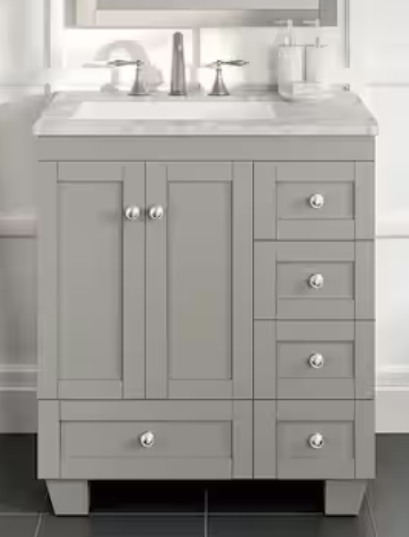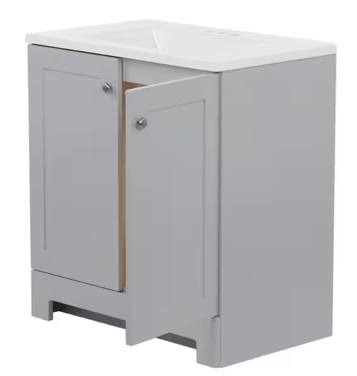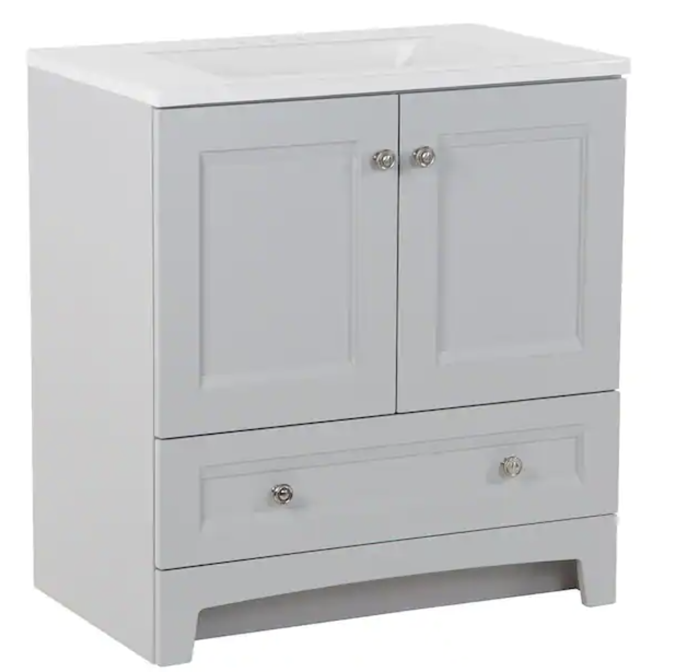 Glacier Bay 30” Freestanding Vanity with White Cultured Marble Top. Available from Home Depot for $199.00 in Pearl Grey only. Made entirely from particle board.