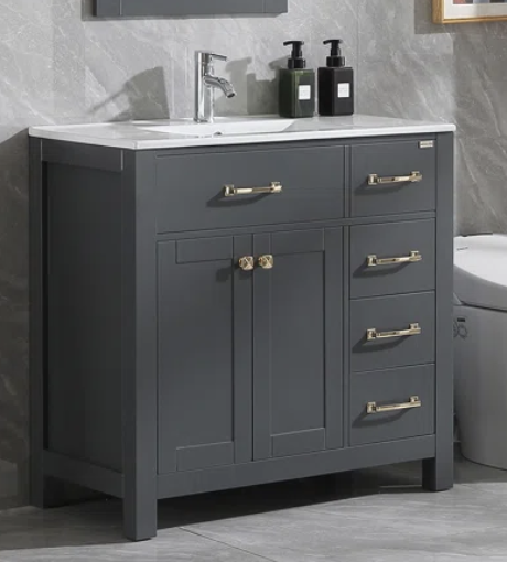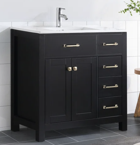 W Online 35” Freestanding Vanity With Ceramic Top. Available from Wayfair for $499.99 (white) or $569.99 (grey or black). Vanity made from MDF and manufactured wood.