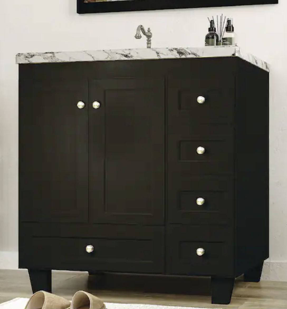 Eviva Acclaim 30” Solid Wood Vanity with Carrera Marble Top. Available from Home Depot for $999 in Espresso, White or Grey or $ 1,029 in Blue. Solid wood construction and real marble top explain higher price tag.