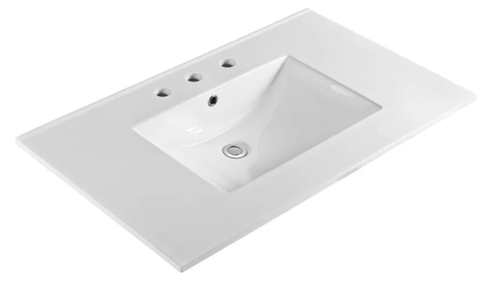 Empire Industries 37” wide x 22” deep White Ceramic Vanity Top for 36” vanity available from Wayfair for $323.90. Sink basin is 20 wide x 12.7long x 5.1 deep. Vanity top is predrilled for 8” widespread faucet.