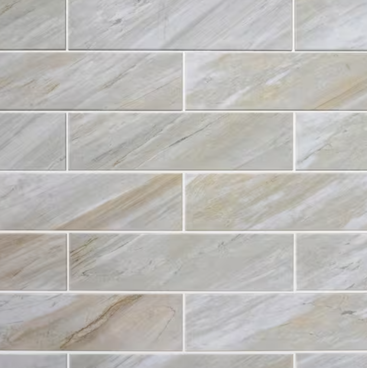 Terra Nuova Brushed Marble Tile in 8” x 16” size from Floor & Decor for $7.10 per tile. Shown here in a vertical Brick pattern.